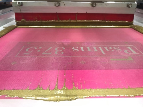 An ink similar to the intended foil color, or an adhesive, is screen printed directly onto a t shirt or garment. This process is pretty identical to screen printing a normal design. After the print, the garment is then cured through a conveyor dryer. Here is where the foil printing process differs from a regular silk screen print...