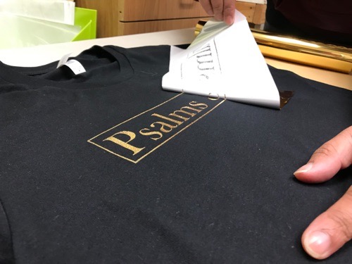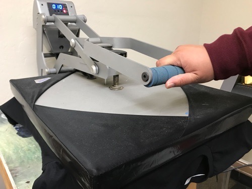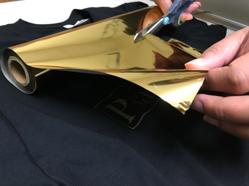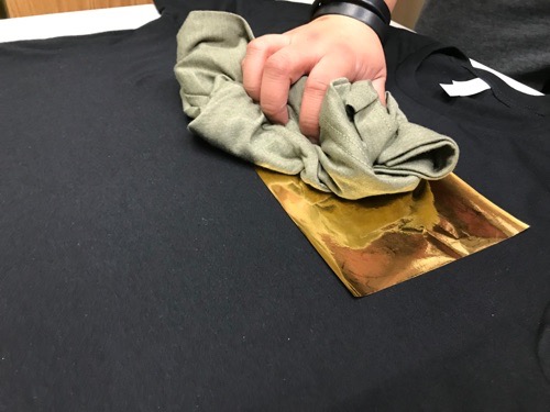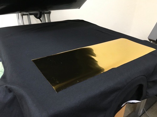 The shirt is then taken to a heat press station where a sheet of foil is placed of the design. The foil is placed onto the shirt, shiny side up, and pressed on the apparel using an industrial heat press.